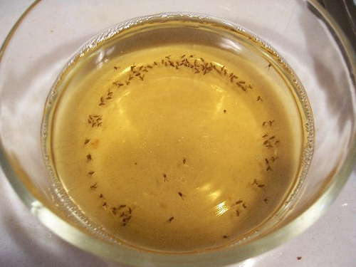 Vinaigre et liquide vaisselle – ajoutez quelques gouttes de liquide vaisselle dans un fond de vinaigre. Le liquide vaisselle casse la tension superficielle à la surface de manière à ce que les moucherons, attirés par le liquide, s’y noient.